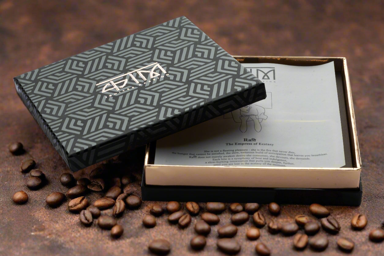 Raति – The Empress of Ecstasy DARK COFFEE weaves its spell, deep, bold, and intoxicating, as it melts into the aphrodisiac trio of Safed Musli, Ginkgo Biloba, and Ashwagandha. Seductive, velvety, and wickedly smooth, Raति is ecstasy, unwrapped one bite at a time.